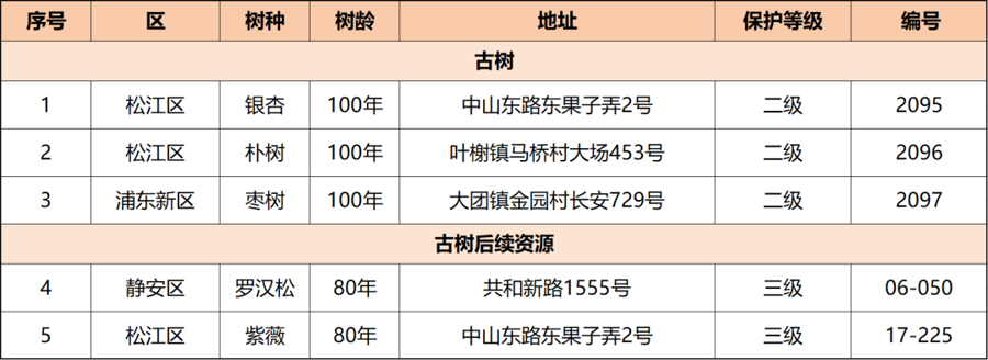 这3株“百岁老人”分别为松江区中山东路东果子弄2号的古银杏(2095号)、松江区叶榭镇马桥村大场453号的朴树(2096号)、浦东新区大团镇金园村一座院落中的枣树(2097号)。2株古树后续资源分别为静安区闸北公园旧钱氏宗祠与基督教堂墓园门房之间的罗汉松(编号06-050)以及与2095号银杏一同生长在松江区中山东路东果子弄2号里的紫薇(编号17-225)。