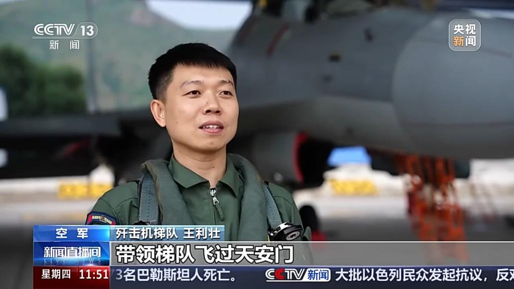 歼击机梯队 王利壮:我在这次任务中,飞的是歼击机梯队的长机位置。作为歼击机梯队的长机,首先它要有稳定性;第二要有柔和性,带领梯队飞过天安门,肯定是感到无比自豪与激动。在通过天安门的时候,可以俯瞰繁华的城市和飘扬的红旗,能看到祖国繁荣富强的同时,又深刻感受到自己肩负着责任。我和战友们将始终牢记党和人民的重托,不断锤炼过硬的飞行技能,为国防贡献自己的全部力量。