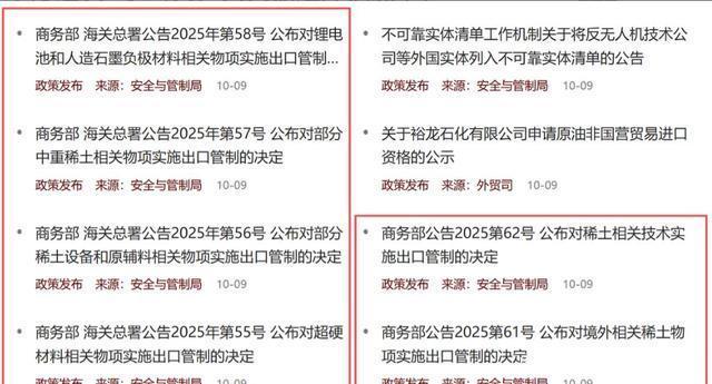 6条公告炸醒美国政要       北京时间10月9日清晨,商务部官网悄然更新的6条公告,已经在太平洋彼岸的美国掀起了轩然大波,这不是简单的政策调整,而是一套精准打在美方产业链七寸上的“组合拳”。 从稀土技术出口到超硬材料管控,从锂电池设备到人造石墨负极材料,几乎把美国高端制造的“命门”挨个点了一遍,更狠的是所有新规都定在11月8日生效,正好卡在中美关税暂缓期结束的最后一夜,时间掐得比钟表还准。       同一时间的美国华盛顿,正是当地时间10月8日深夜,知情人士后来透露,当天最先收到消息的是美国商务部,工作人员发现中方公告后,第一时间将文件送到了正在休假的商务部长卢特尼克手中,这位平时总爱对中国议题指手画脚的官员,看完文件后沉默了足足十分钟,才拨通了财长贝森特的电话。