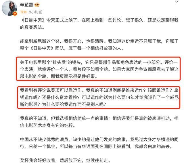 随后,辛芷蕾发长文讲她的获奖电影、也是11月7日上映的《日掛中天》。电影首映,主演发长文宣传很正常,但辛芷蕾这个发文显然不是宣传这么简单。