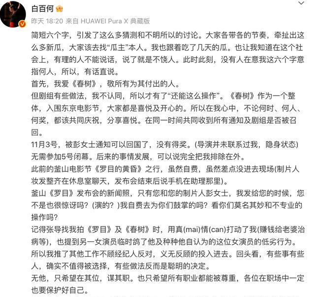 有关注白百何东京电影节事件的人应该知道,事情就是她出演的大女主电影没拿到奖,导演和制片人甚至让她提前回国,连闭幕式都不让她参加。结果,导演和男主拿奖了。于是,白百何发长文回应,直接对电影导演和制片人开撕。